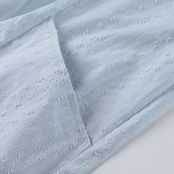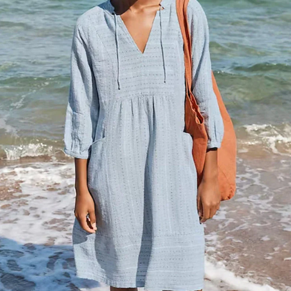 Zanurz się w niewymuszonej elegancji dzięki naszej letniej bawełnianej lnianej sukience z dekoltem w szpic, będącej uosobieniem wyluzowanego wyrafinowania. Wykonana z najwyższej jakości materiałów, ta sukienka została zaprojektowana, aby zapewnić ci chłód i styl podczas ciepłych letnich miesięcy.