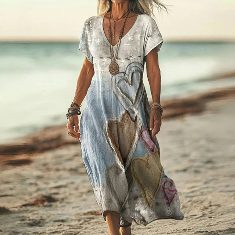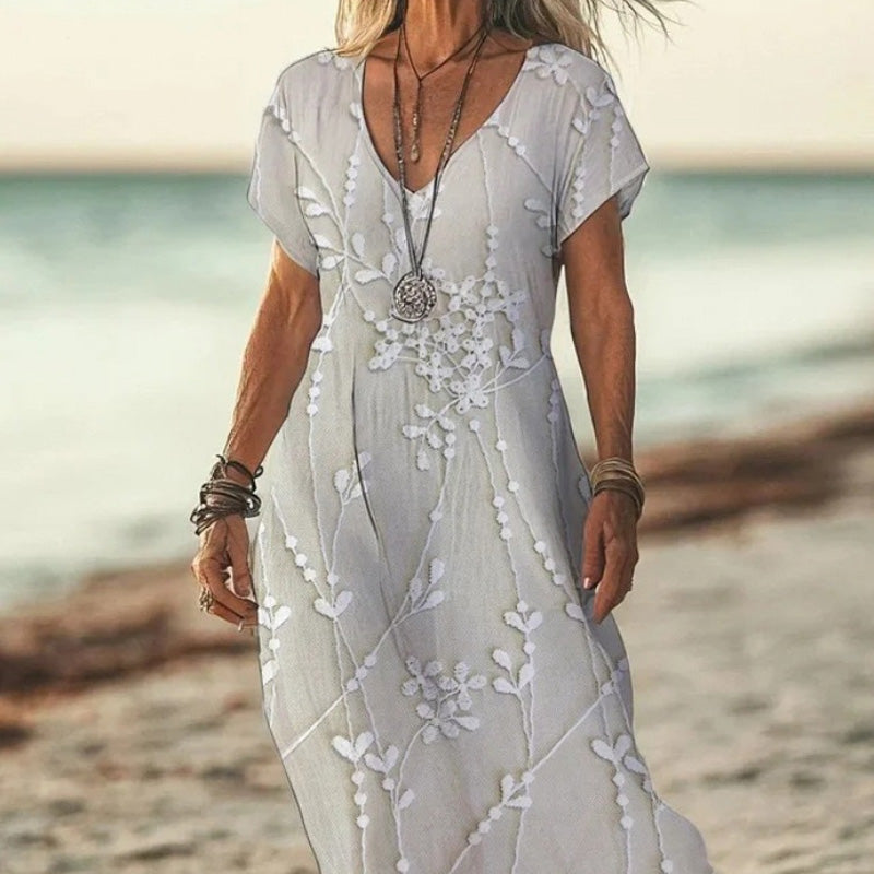 PROSTY DEKOLT W SZPIC I KRÓTKI RĘKAW - Delikatny dekolt w kształcie litery V wydłuża dekolt, zapewniając elegancką sylwetkę, a krótkie rękawy zapewniają wygodne okrycie. Starannie zaprojektowane pachy zapobiegają powstawaniu szwów i pozwalają na pełną swobodę ruchów, dzięki czemu ta sukienka jest idealna na swobodne wyjścia i specjalne okazje.