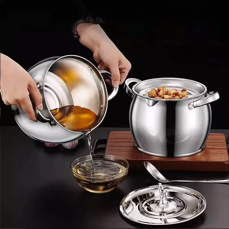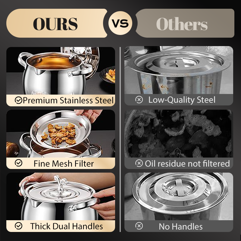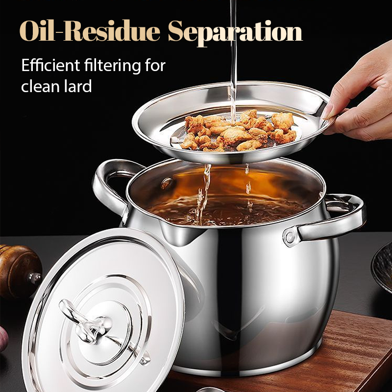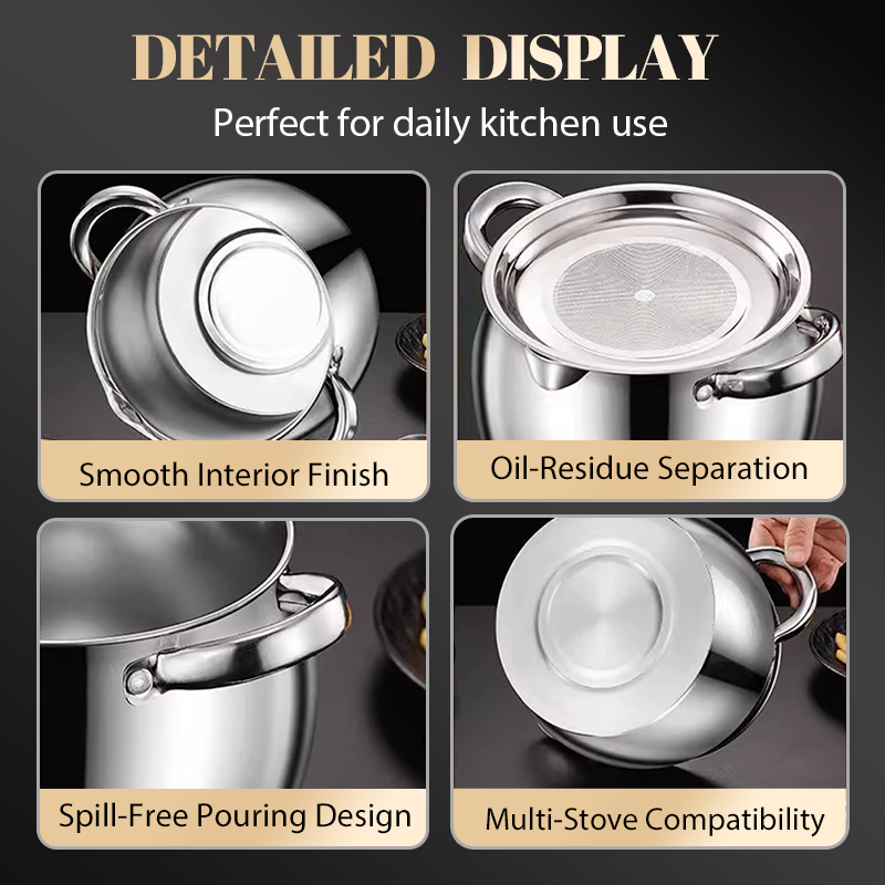 SKUTECZNE ODDZIELANIE RESZTEK OLEJU: Zaprojektowany z grubego korpusu ze stali nierdzewnej i drobnego sitka, ten pojemnik na smalec zapewnia dokładną filtrację oleju. Skutecznie oddziela resztki oleju podczas i po wytapianiu, zapewniając czysty, nieskażony smalec przy minimalnym wysiłku.