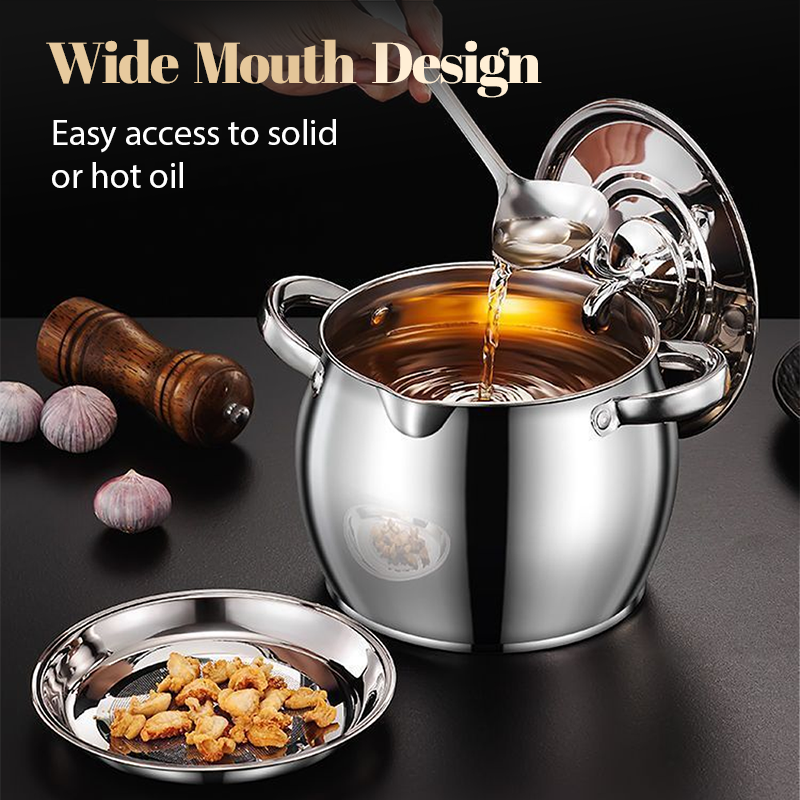 SZEROKI OTWÓR: Szeroki otwór ułatwia dostęp do zestalonego smalcu lub płynne nalewanie gorącego oleju. Koniec z problemami z wąskimi otworami — idealny do codziennego użytku w kuchni, niezależnie od tego, czy przechowujesz olej, czy podajesz zupę.