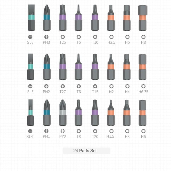 24 końcówki wkrętakowe ze stali stopowej S2 chromowo-molibdenowej klasy przemysłowej, poddawane ciągłej obróbce cieplnej. 5 rodzajów końcówek wkrętakowych, aby zaspokoić potrzeby profesjonalnego użytku, życia domowego, pracy, majsterkowania i konserwacji. Oszczędność pracy dzięki grzechotce o 6,2-stopniowej konstrukcji, 58-zębowej grzechotce o dodatnim i ujemnym obrocie, oszczędność 80% wysiłku. 👨🔧