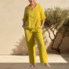 WYGODNA MIESZANKA BAWEŁNY I LNU - Wykonany z wysokiej jakości mieszanki bawełny i lnu, ten dwuczęściowy garnitur oferuje idealną równowagę między wygodą i stylem. Naturalna oddychalność tkaniny zapewnia komfort przez cały dzień, dzięki czemu idealnie nadaje się na swobodne wyjścia lub odpoczynek w domu.