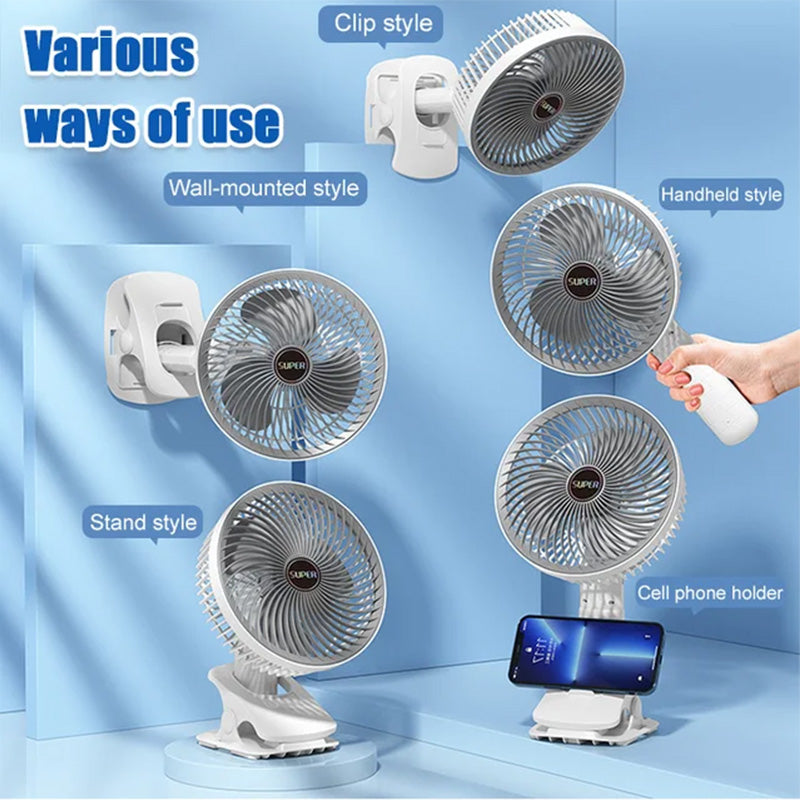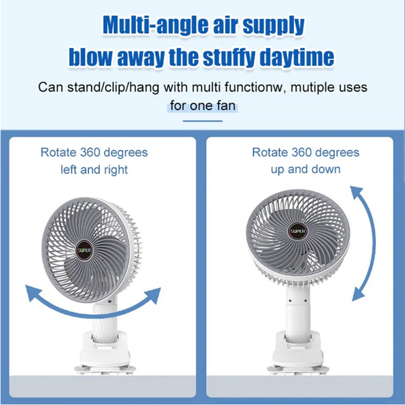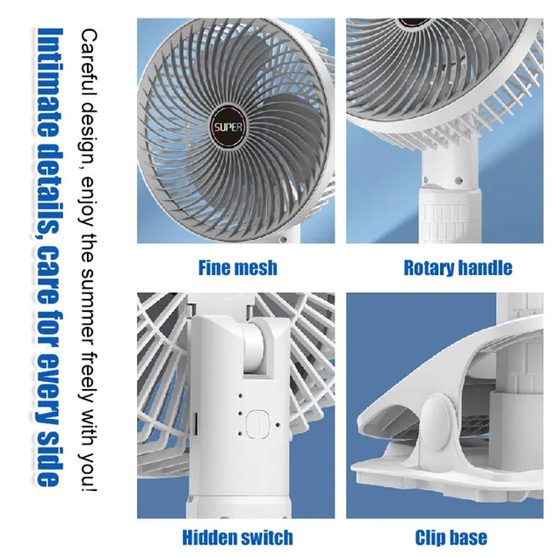 WIELOFUNKCYJNY PRZENOŚNY MINIWENTYLATOR Z KLIPSEM - Wielofunkcyjny przenośny miniwentylator posiada wszechstronną konstrukcję z klipsem, która oferuje cztery różne sposoby korzystania z wentylatora. Można go umieścić w pozycji pionowej na płaskiej powierzchni, zamontować na ścianie w celu chłodzenia bez użycia rąk, przypiąć do różnych przedmiotów, takich jak biurko lub wózek, a nawet trzymać w dłoni w celu uzyskania bezpośredniego przepływu powietrza.