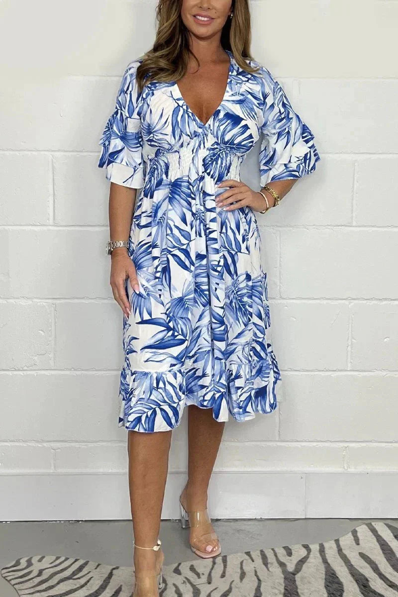 🌺Rozkloszowana sukienka midi z nadrukiem i dekoltem w serek
