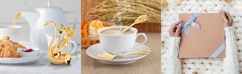 [Szerokie zastosowanie] Uchwyt Swan i 6 łyżeczek doskonale nadają się do kawy, napojów, herbaty lub spożywania deserów, owoców, koktajli, mini ciast, przystawek sałatkowych itp. Zestaw może być używany w restauracjach, kawiarniach i jako zastawa stołowa lub dekoracja w kuchni.