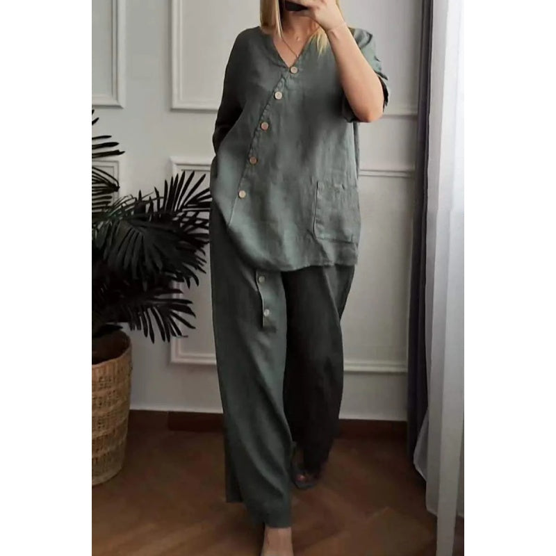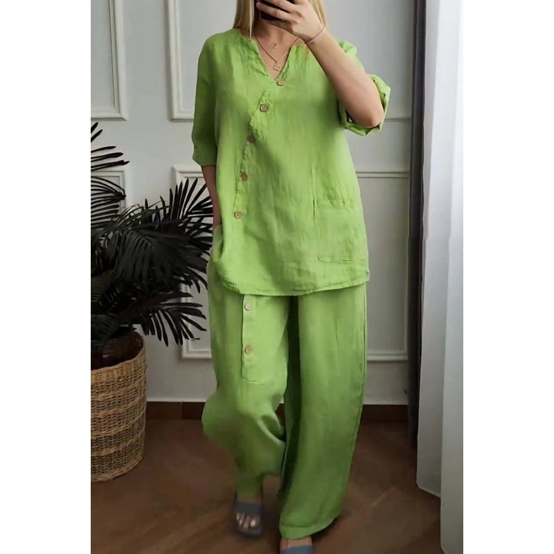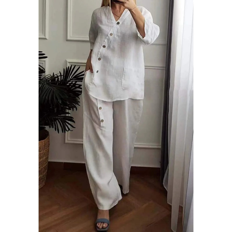 Modny szyk: dekolt w kształcie litery V ze średnimi rękawami i szerokie spodnie z charakterystycznymi nieregularnymi guzikami.