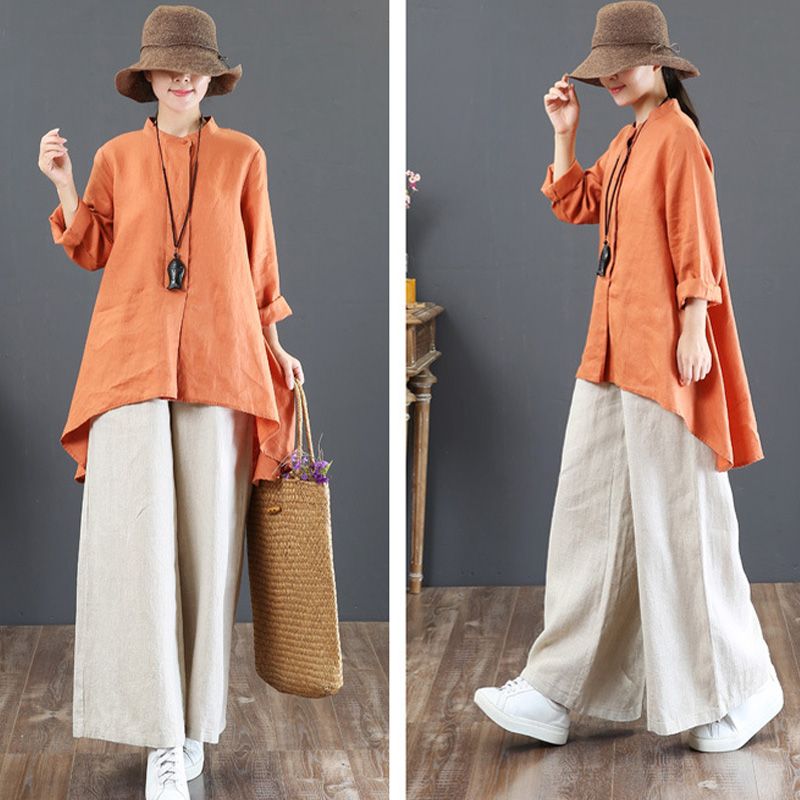 1 * Spodnie Damskie z Bawełny i Lnu o Szerokich Nogawkach